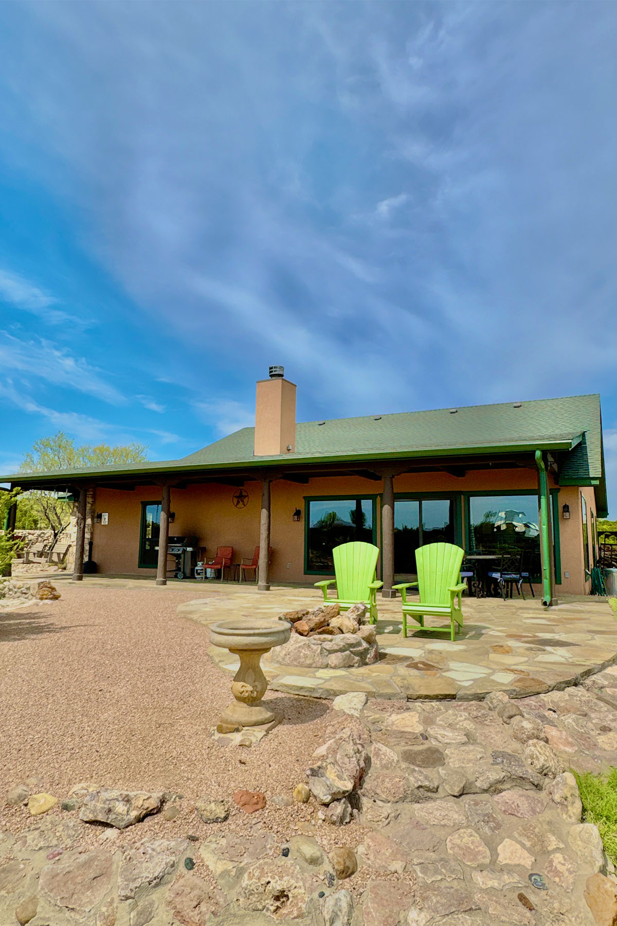 The stronghold of Fortress Cabin takes its name for the centerpiece of its view gazing at the Fortress Cliffs along the east rim of Palo Duro Canyon State Park, a protected six miles of cliffs overlooking the Grand Canyon of Texas. The bluff’s look the same way the first Texans saw it — unspoiled. The steep margins of the Fortress Cliffs consist of bright, banded layers of orange, red, brown, yellow, and white rocks that represent four geologic periods. Adding to the cliffs scenic grandeur are numerous pinnacles, buttes, and mesas. Doves Rest Fortress is a place of exceptional security, privacy and refuge. Modern but rustic, this two-bedroom, two-bath cabin is immaculate and fully furnished. It features a wood burning fireplace, covered patio facing east with porch swings and propane grill. The fully equipped kitchen offers everything you need to make you feel at home. Clean linens and towels are provided for your comfort along with extra blankets for cozy nights. A 70” T.V. in the living area makes the nights even more entertaining! Guests can unwind around the beautiful flagstone patio. The combination of upscale amenities and stunning vistas is what makes this Palo Duro Canyon Cabin so attractive to the discriminating intrepid traveler.