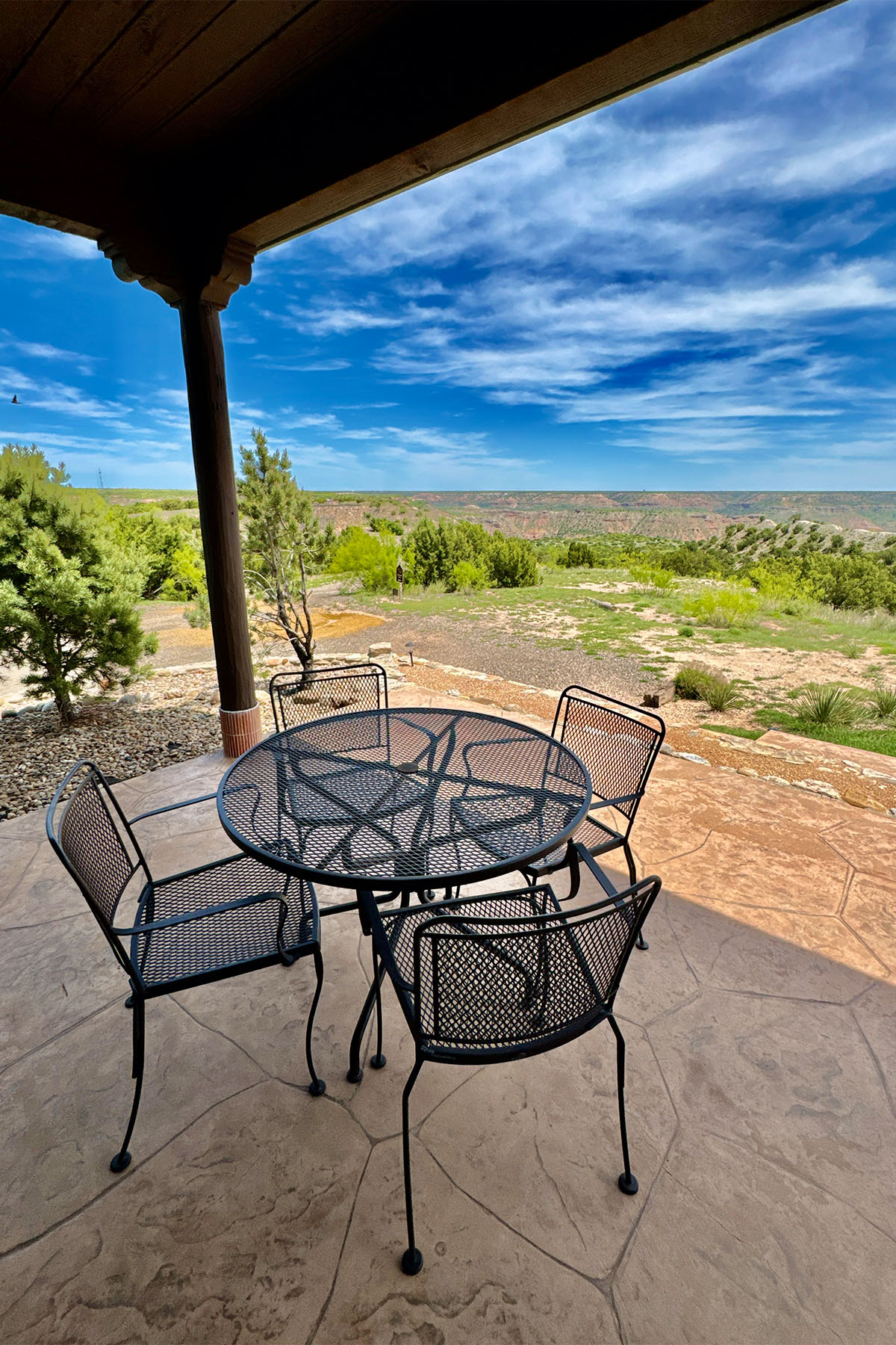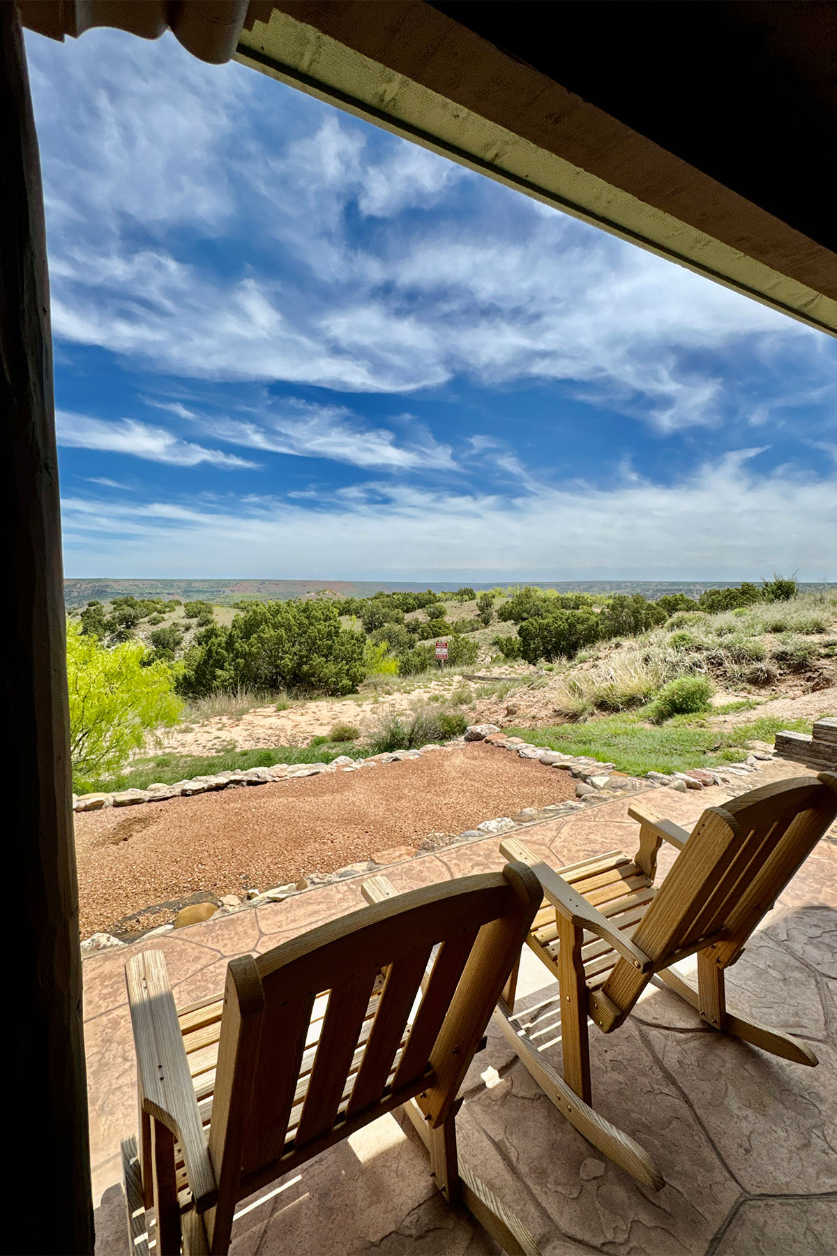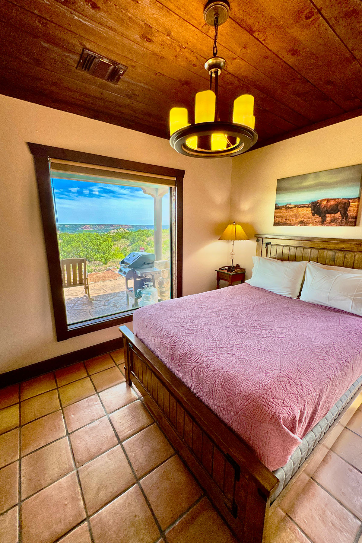 This “aerial lift” of a cabin takes its name from the Sky Ride concession that operated at Palo Duro Canyon State Park in the 1960’s. The original ride’s abutment is sitting next to this cabin reminiscent of the good-old-by-gone-days when station wagons and family vacations were the norm, and state parks were a favorite place to take them. A series of chairlift seats moved excited park visitors from the canyon floor hundreds of feet above to the top of a mesa that can be seen below from this cabin. Now, excited ChairLift cabin guests unwind and enjoy magical moments at dawn and dusk when the golden light plays over the soaring cliffs and rock spires of Palo Duro. One of the best features of the fantastic view from this cabin is the interplay of blue sky, brick-red rock and lime-green vegetation. ChairLift is the perfect Palo Duro Escape for the nostalgic and adventuress traveler.