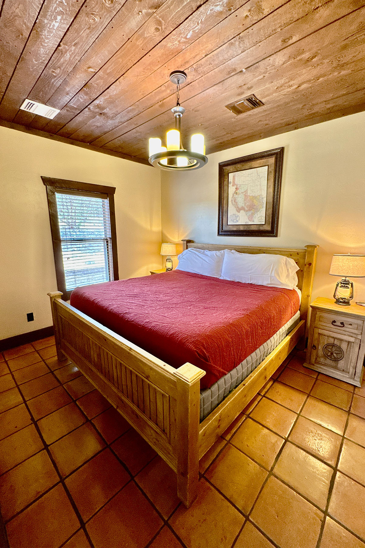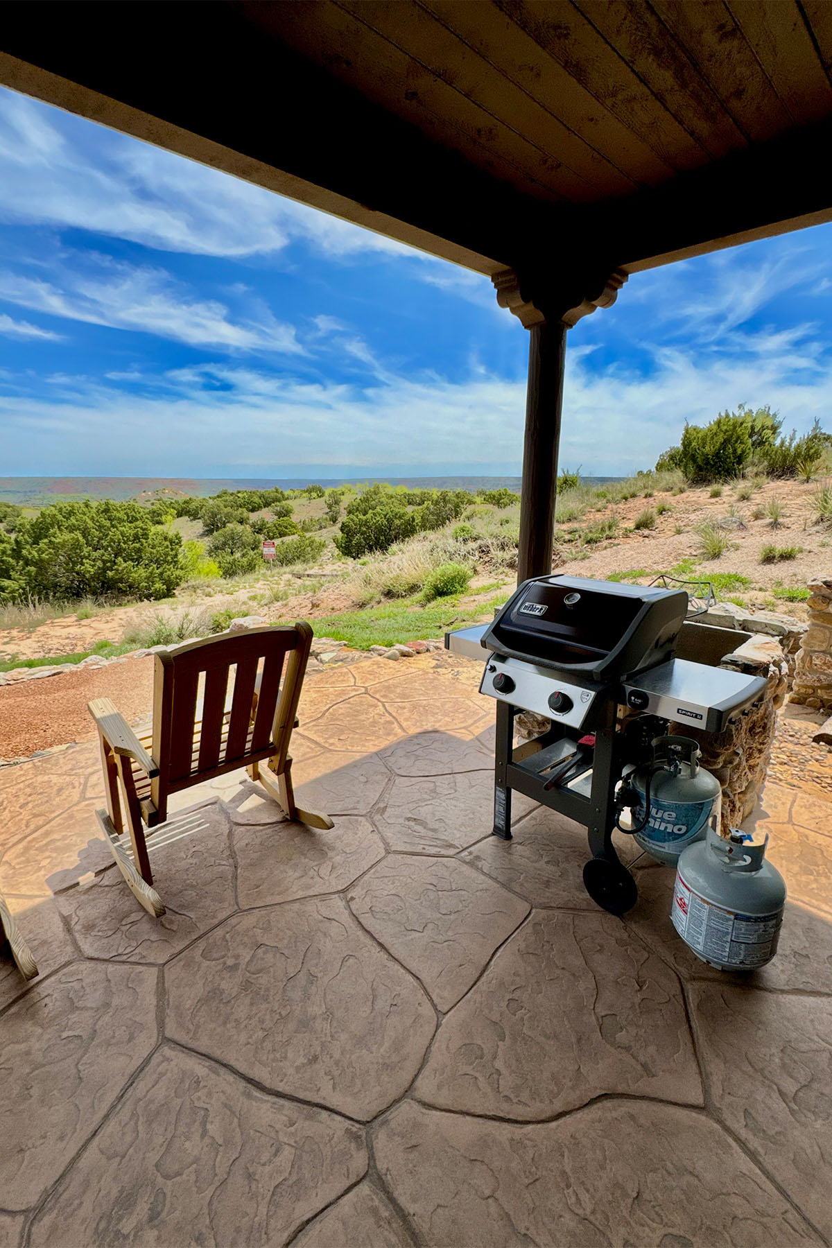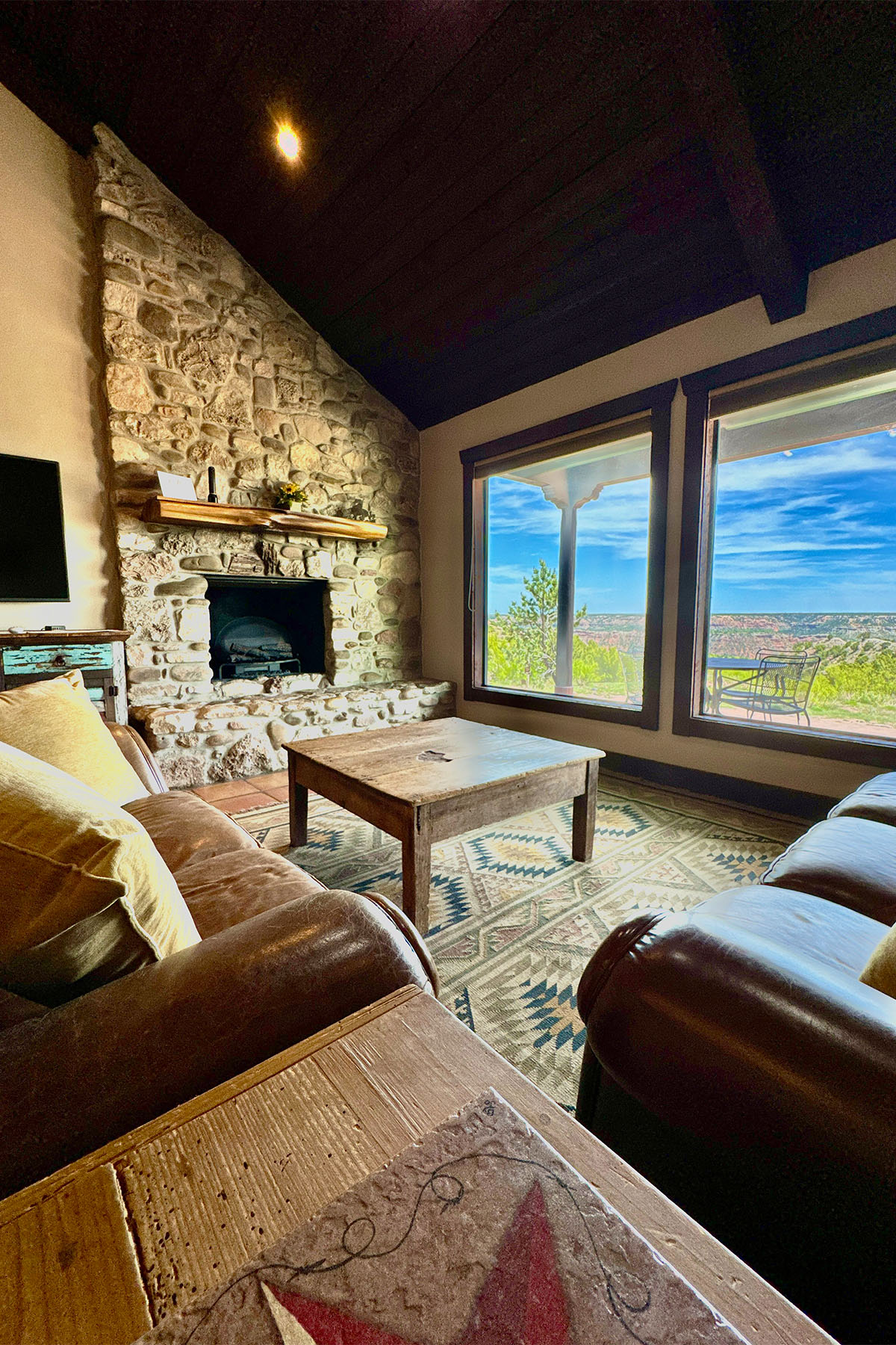 This “aerial lift” of a cabin takes its name from the Sky Ride concession that operated at Palo Duro Canyon State Park in the 1960’s. The original ride’s abutment is sitting next to this cabin reminiscent of the good-old-by-gone-days when station wagons and family vacations were the norm, and state parks were a favorite place to take them. A series of chairlift seats moved excited park visitors from the canyon floor hundreds of feet above to the top of a mesa that can be seen below from this cabin. Now, excited ChairLift cabin guests unwind and enjoy magical moments at dawn and dusk when the golden light plays over the soaring cliffs and rock spires of Palo Duro. One of the best features of the fantastic view from this cabin is the interplay of blue sky, brick-red rock and lime-green vegetation. ChairLift is the perfect Palo Duro Escape for the nostalgic and adventuress traveler.