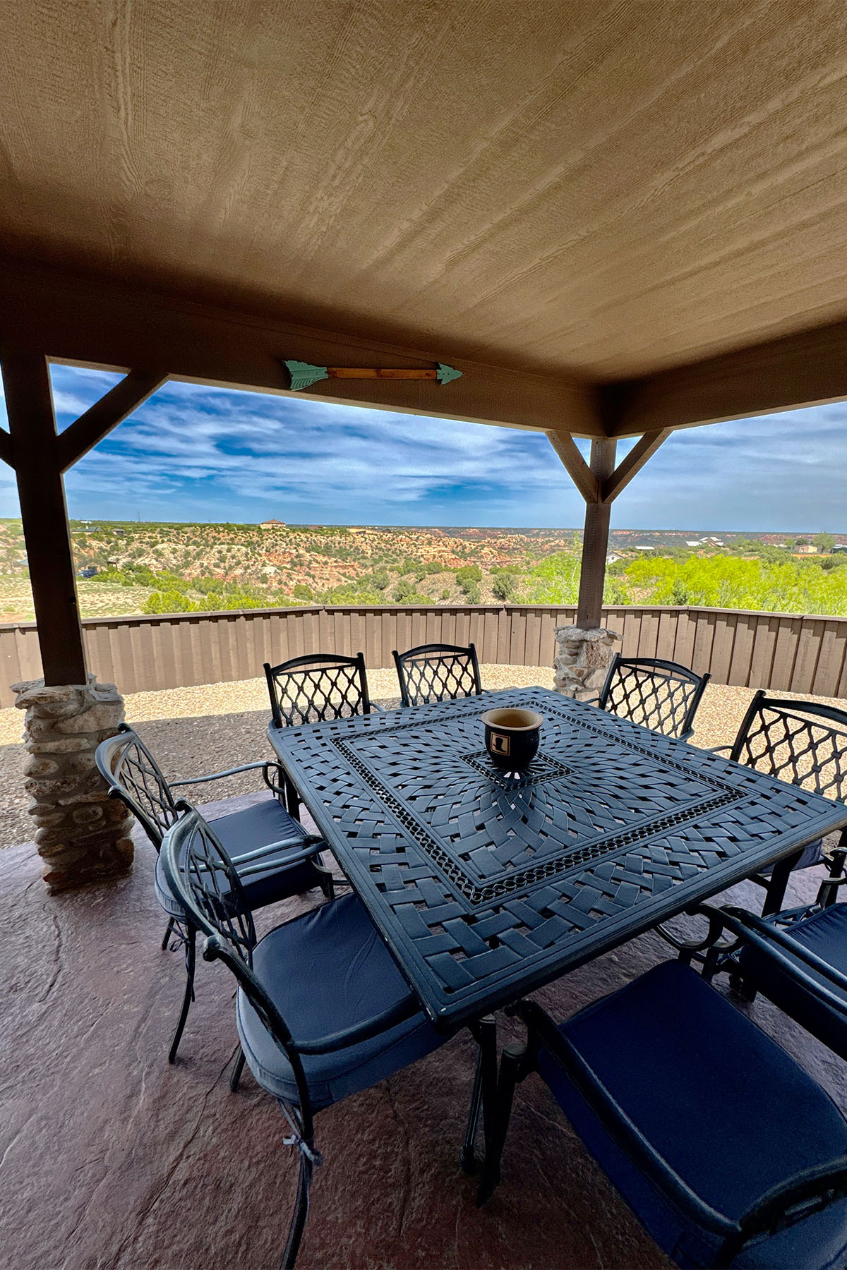 Unwind and enjoy magical moments while the golden light mixed with clouds plays over the expanse of Palo Duro Canyon State Park. One of the best features of the lovely view from this cabin is the vistas one can see in an 180 degree angle.