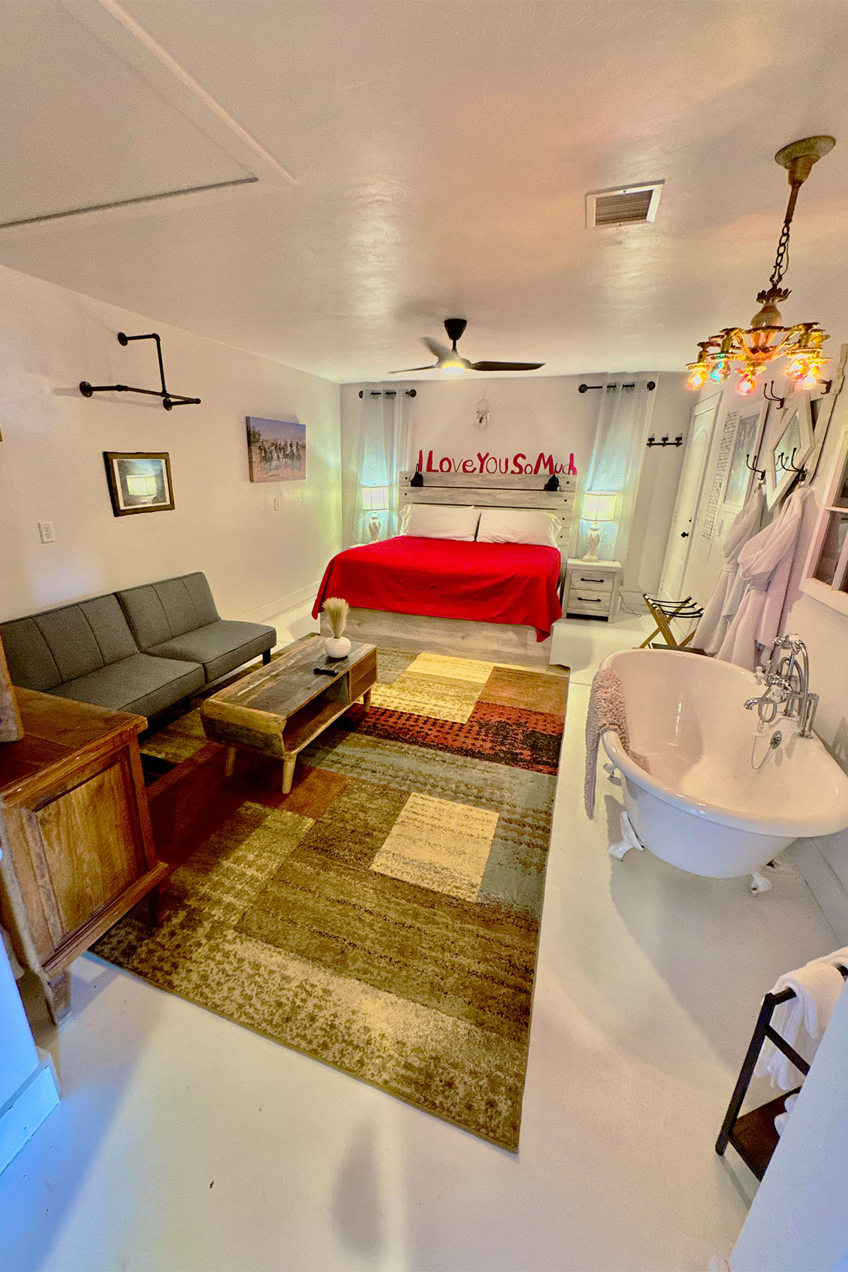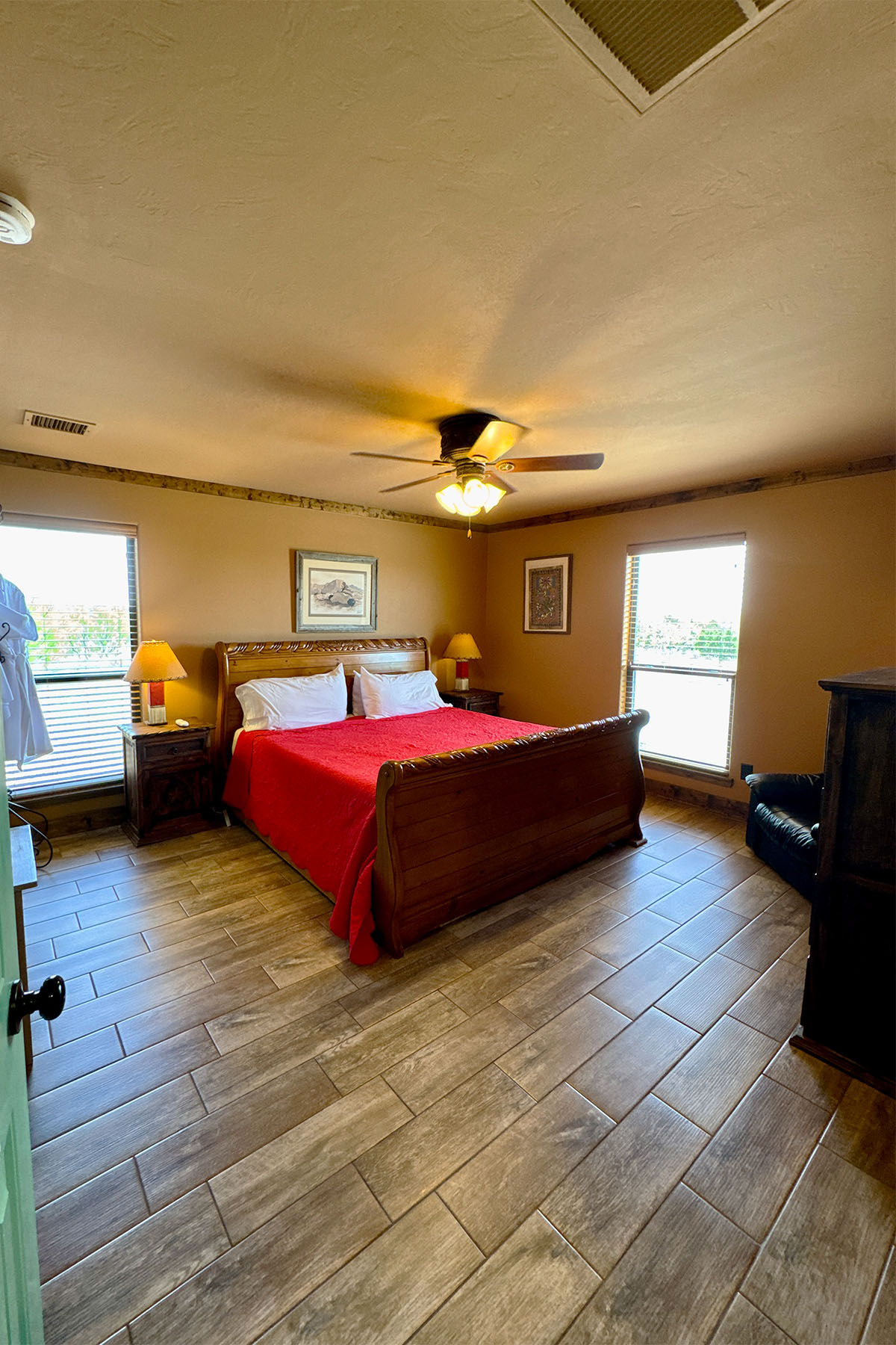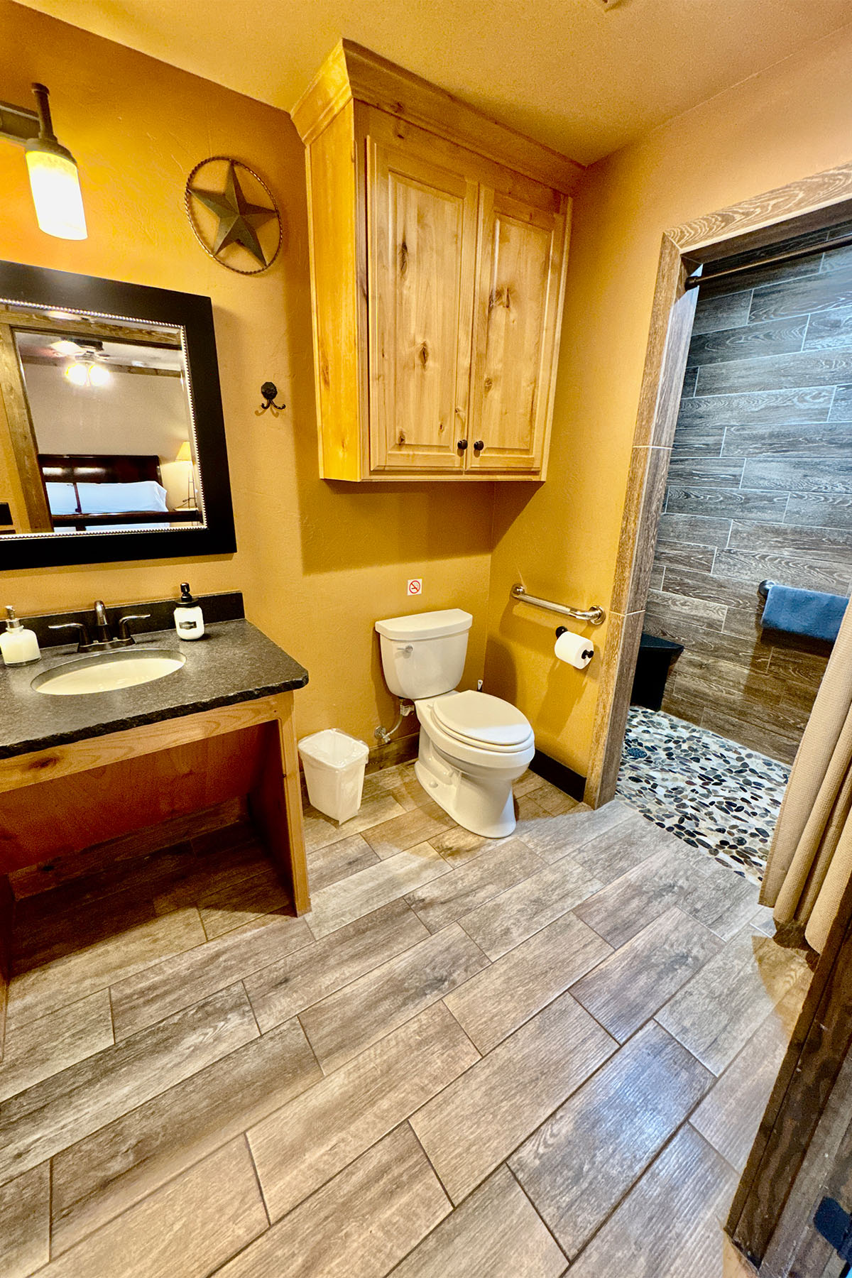 Comanche in their native language is “Numinu”, meaning the People. And, Comanche Cabin is just that…for the People. We are proud to bring you this newly constructed home with a universal and accessible design to accommodate a wide variety of guests. This single floor house has been specially designed to accommodate people of all ages, genders, sizes and physical abilities. 36” wide doorways and hallways, generously sized bathrooms with roll in shower, staggered height kitchen countertops, front entrance and back patio low thresholds for wheelchair ease of access are some of the notable features that make Doves Rest Cabins – Comanche accessible to the PEOPLE.