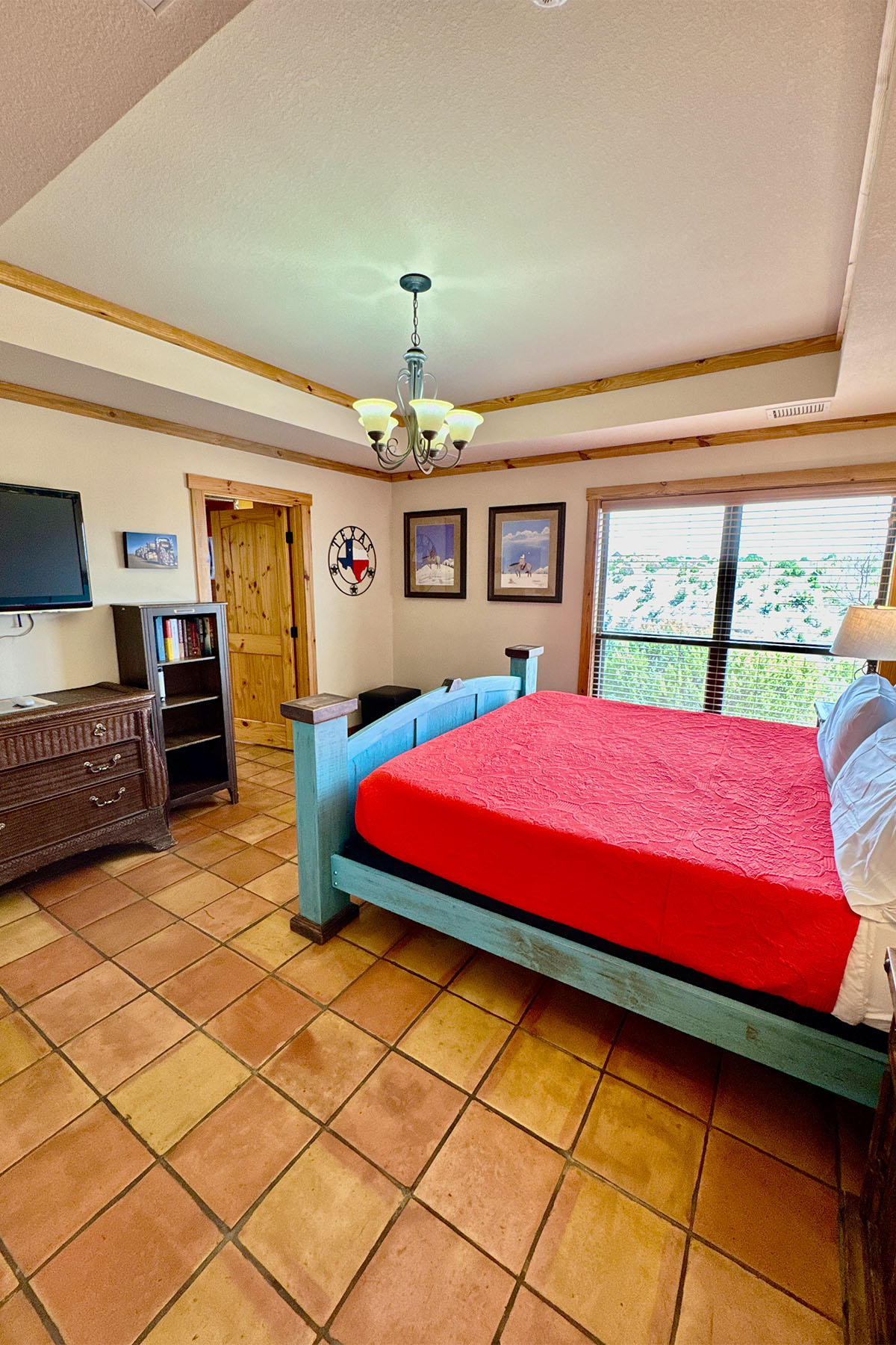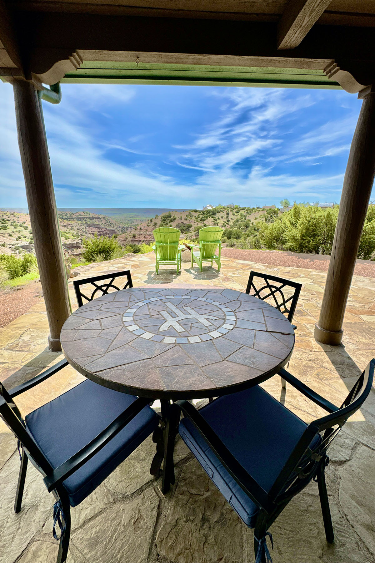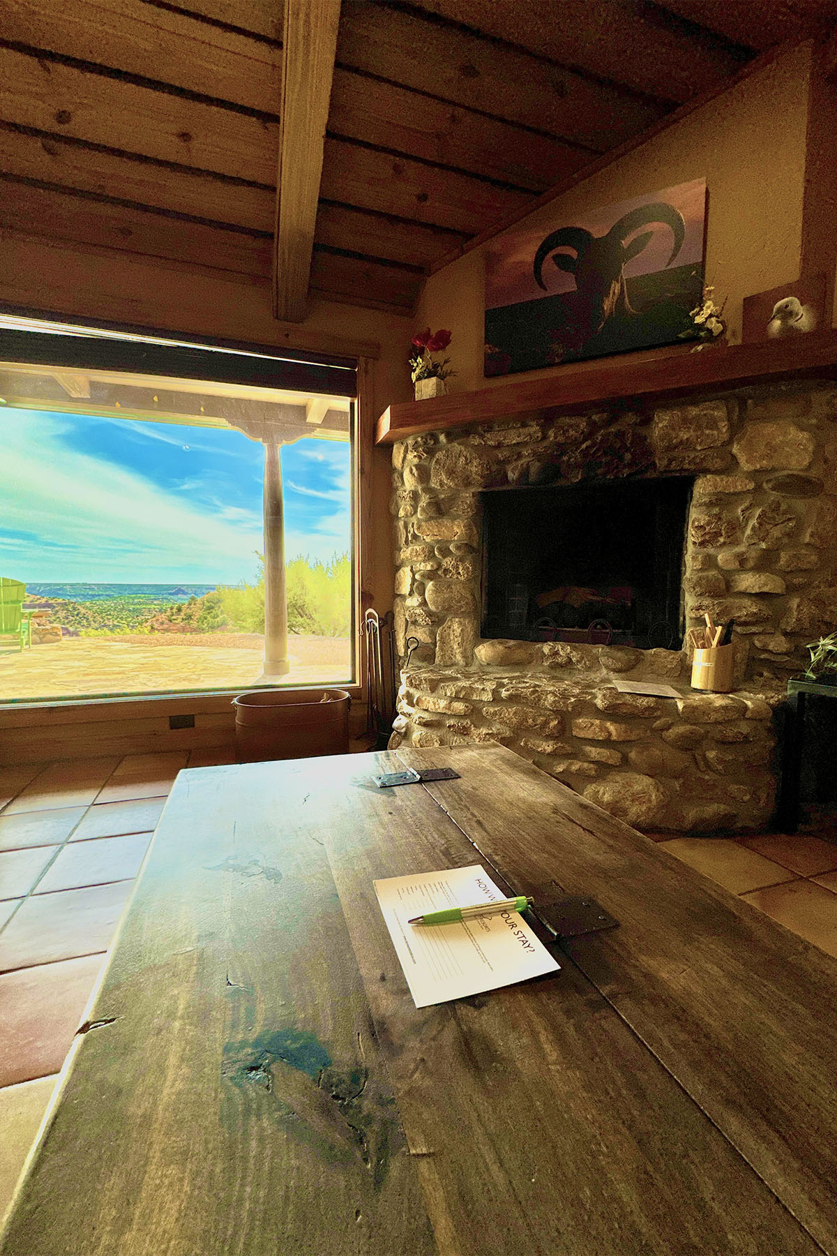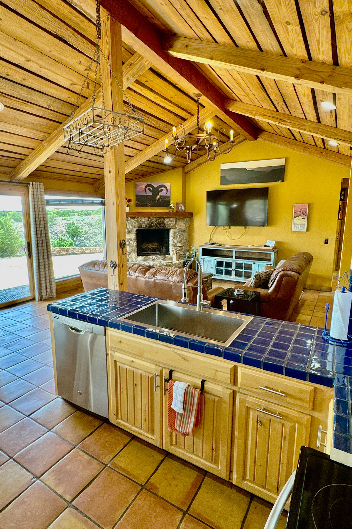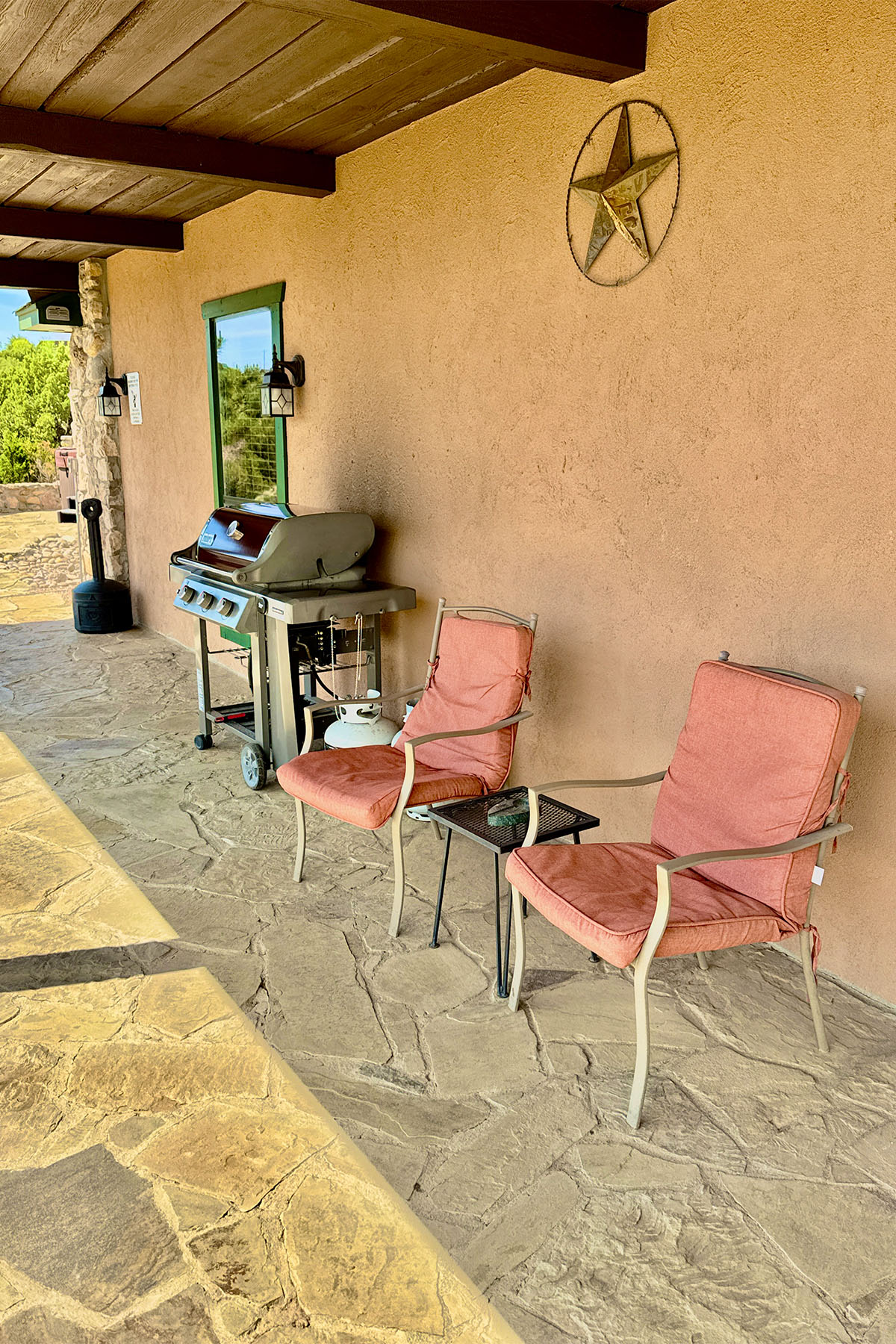 Modern but rustic, this two-bedroom, two-bath cabin is immaculate and fully furnished. It features a wood burning fireplace, covered patio facing east with porch swings and propane grill. The fully equipped kitchen offers everything you need to make you feel at home. Clean linens and towels are provided for your comfort along with extra blankets for cozy nights. A 70” T.V. in the living area makes the nights even more entertaining! Guests can unwind around the beautiful flagstone patio. The combination of upscale amenities and stunning vistas is what makes this Palo Duro Canyon Cabin so attractive to the discriminating intrepid traveler.