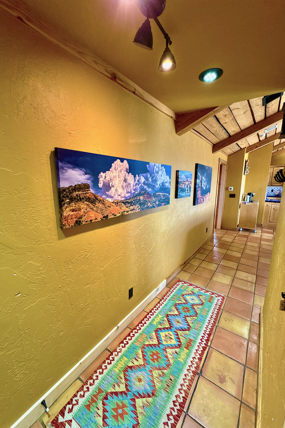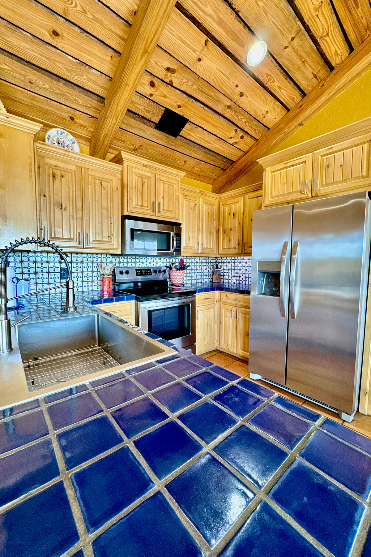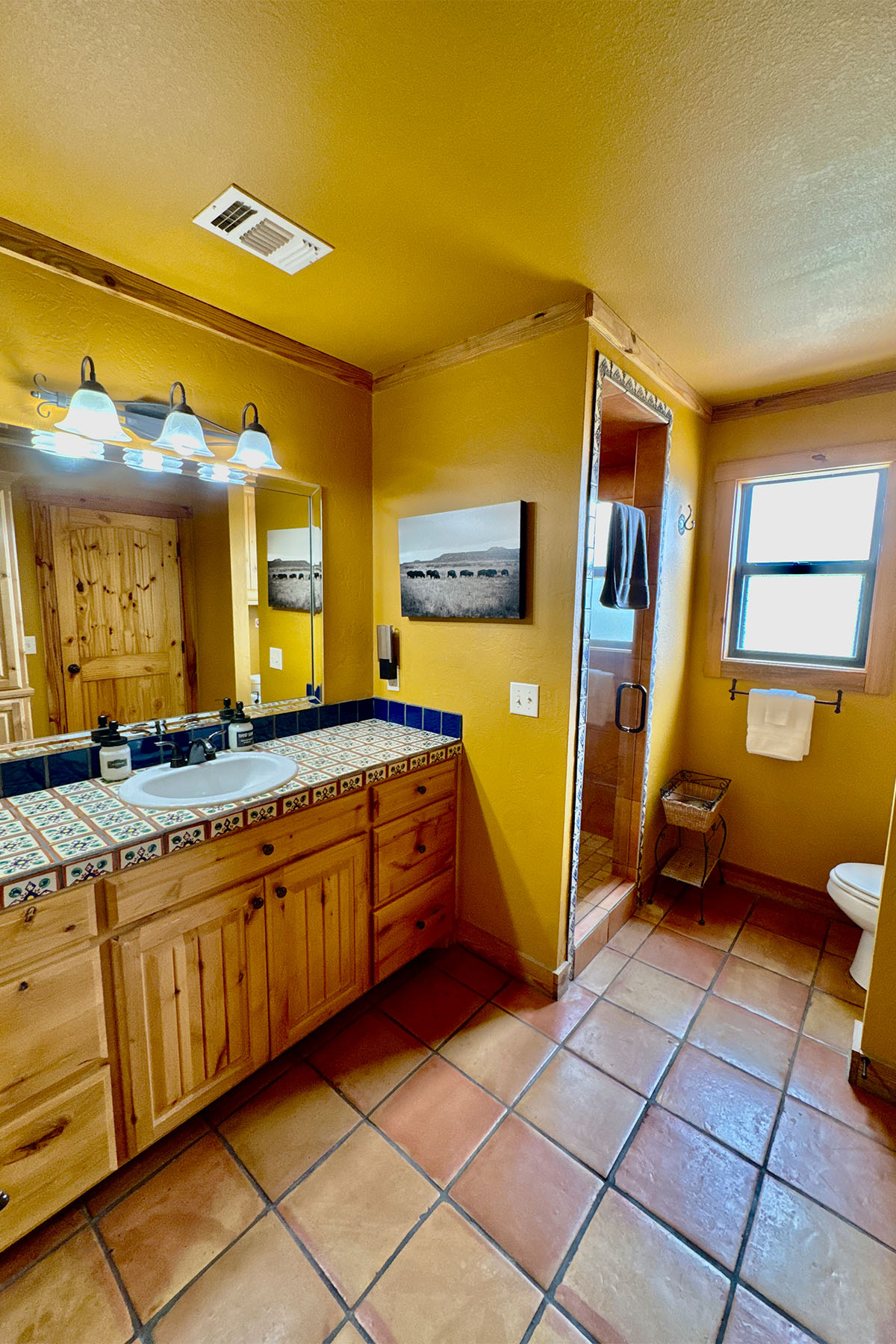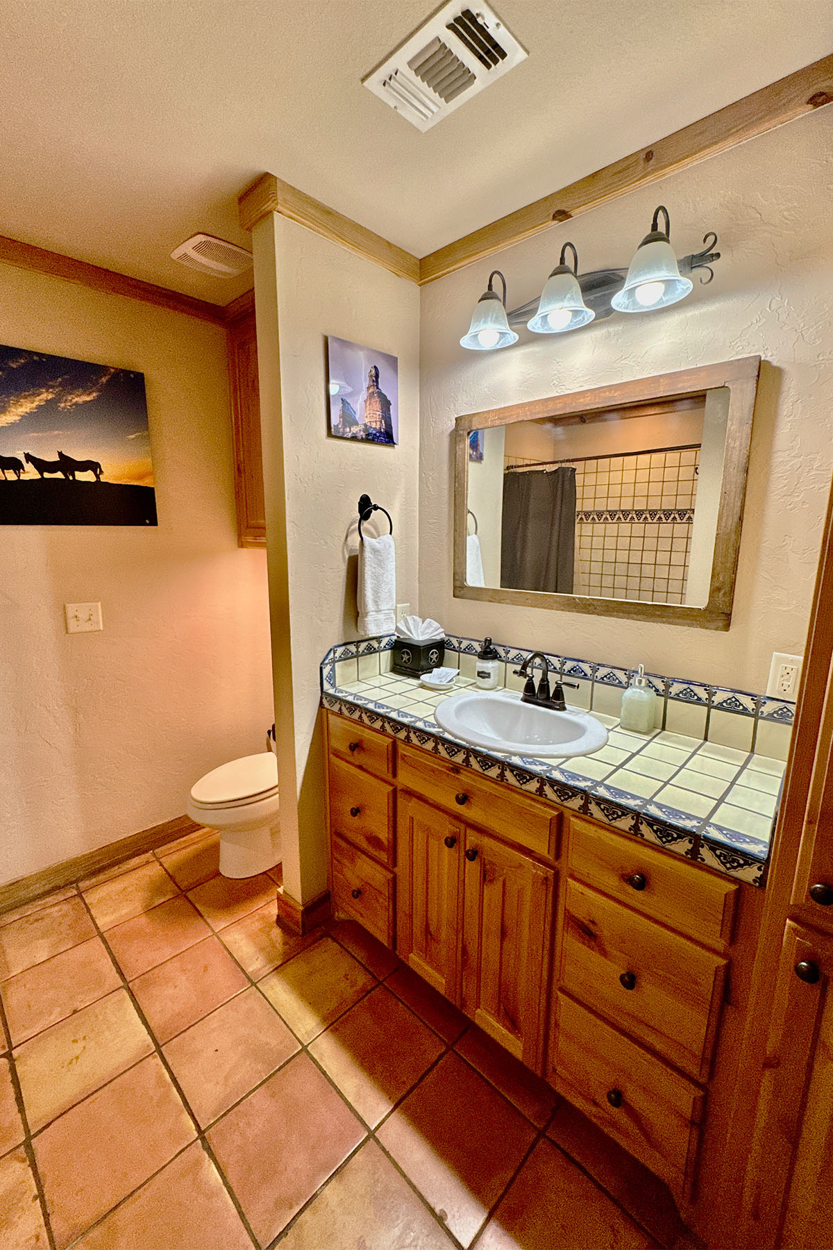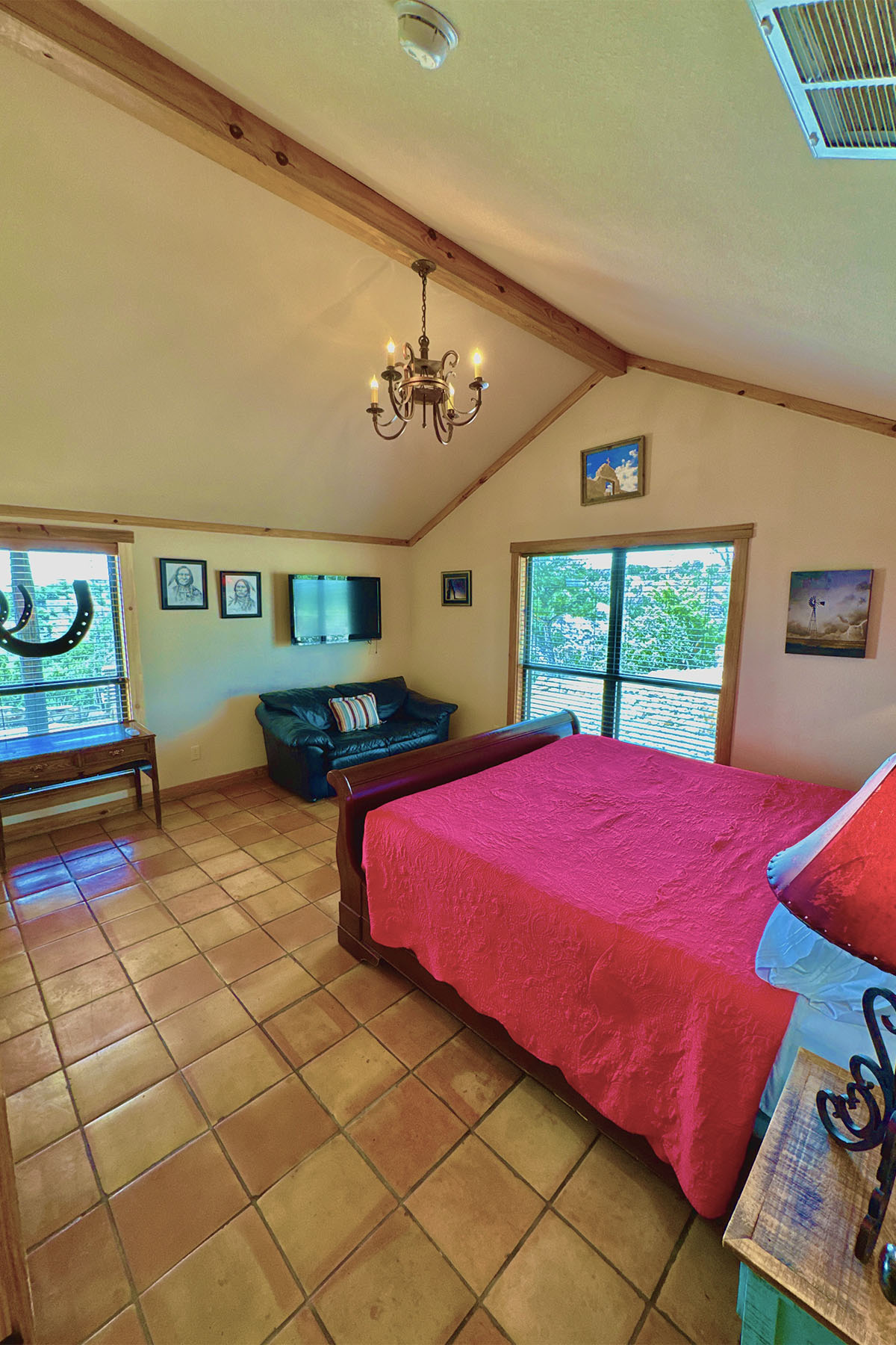Modern but rustic, this two-bedroom, two-bath cabin is immaculate and fully furnished. It features a wood burning fireplace, covered patio facing east with porch swings and propane grill. The fully equipped kitchen offers everything you need to make you feel at home. Clean linens and towels are provided for your comfort along with extra blankets for cozy nights. A 70” T.V. in the living area makes the nights even more entertaining! Guests can unwind around the beautiful flagstone patio. The combination of upscale amenities and stunning vistas is what makes this Palo Duro Canyon Cabin so attractive to the discriminating intrepid traveler.