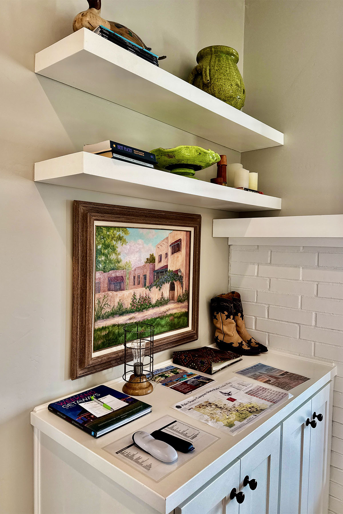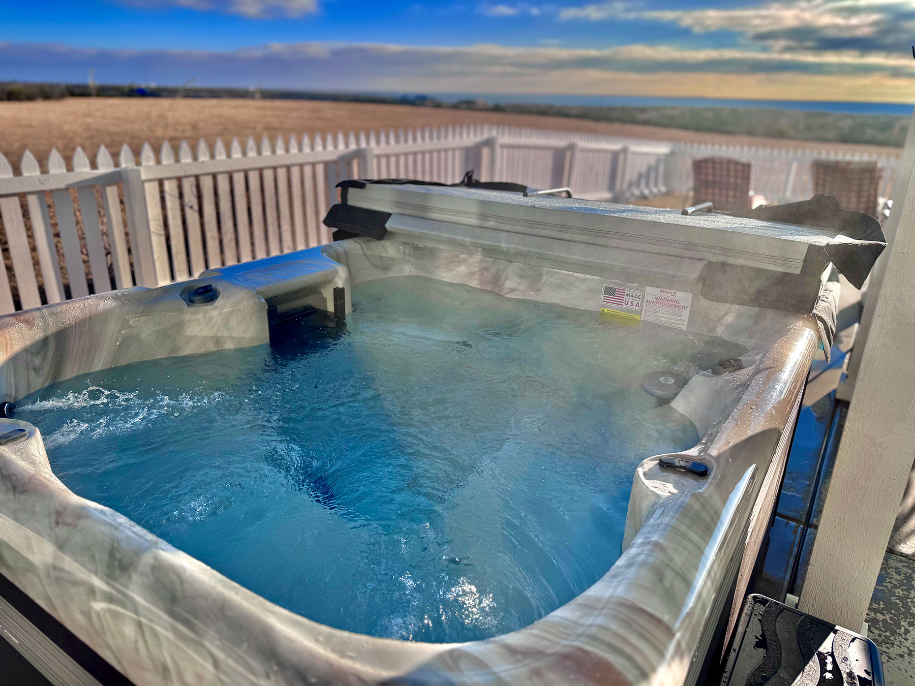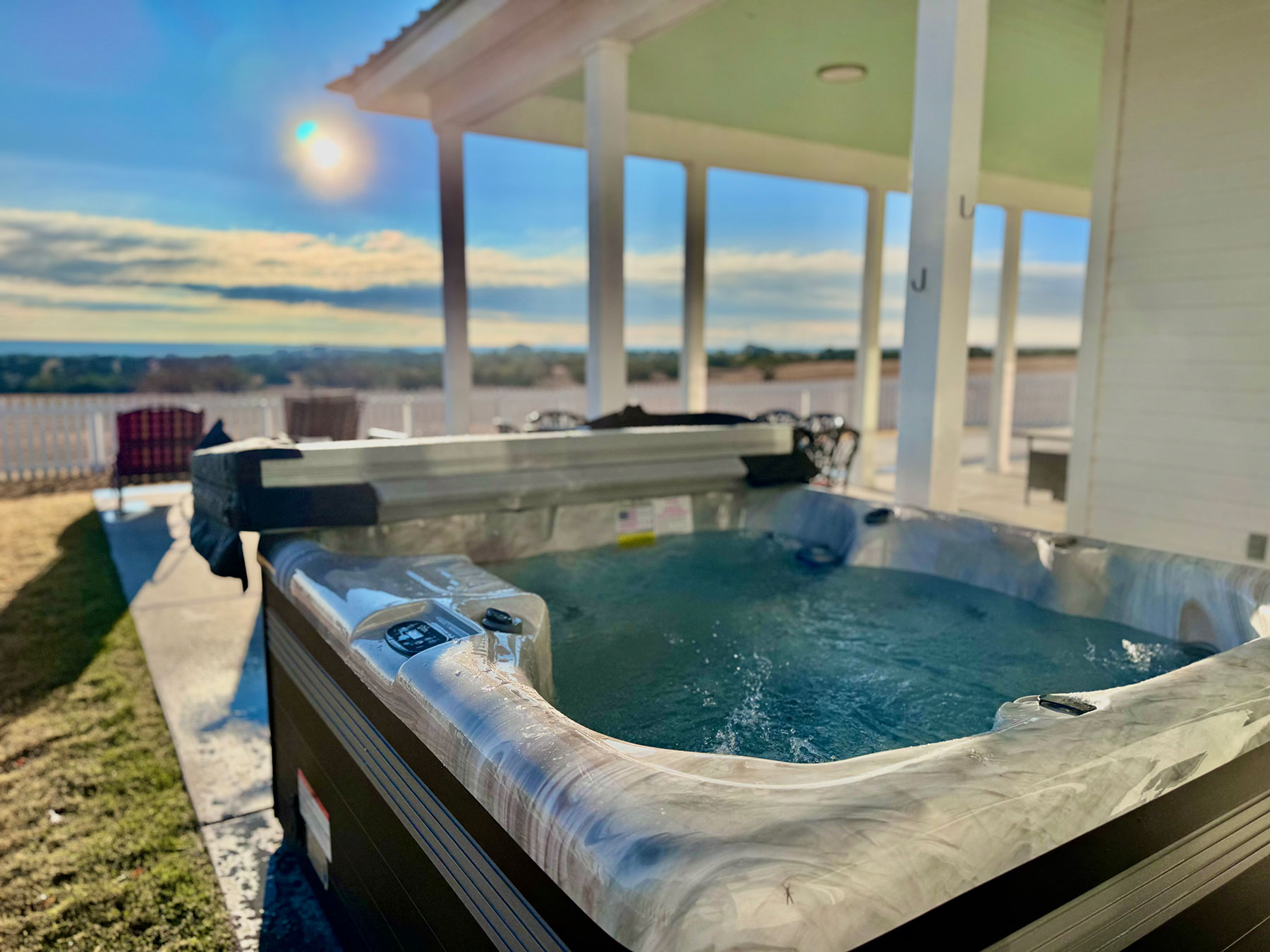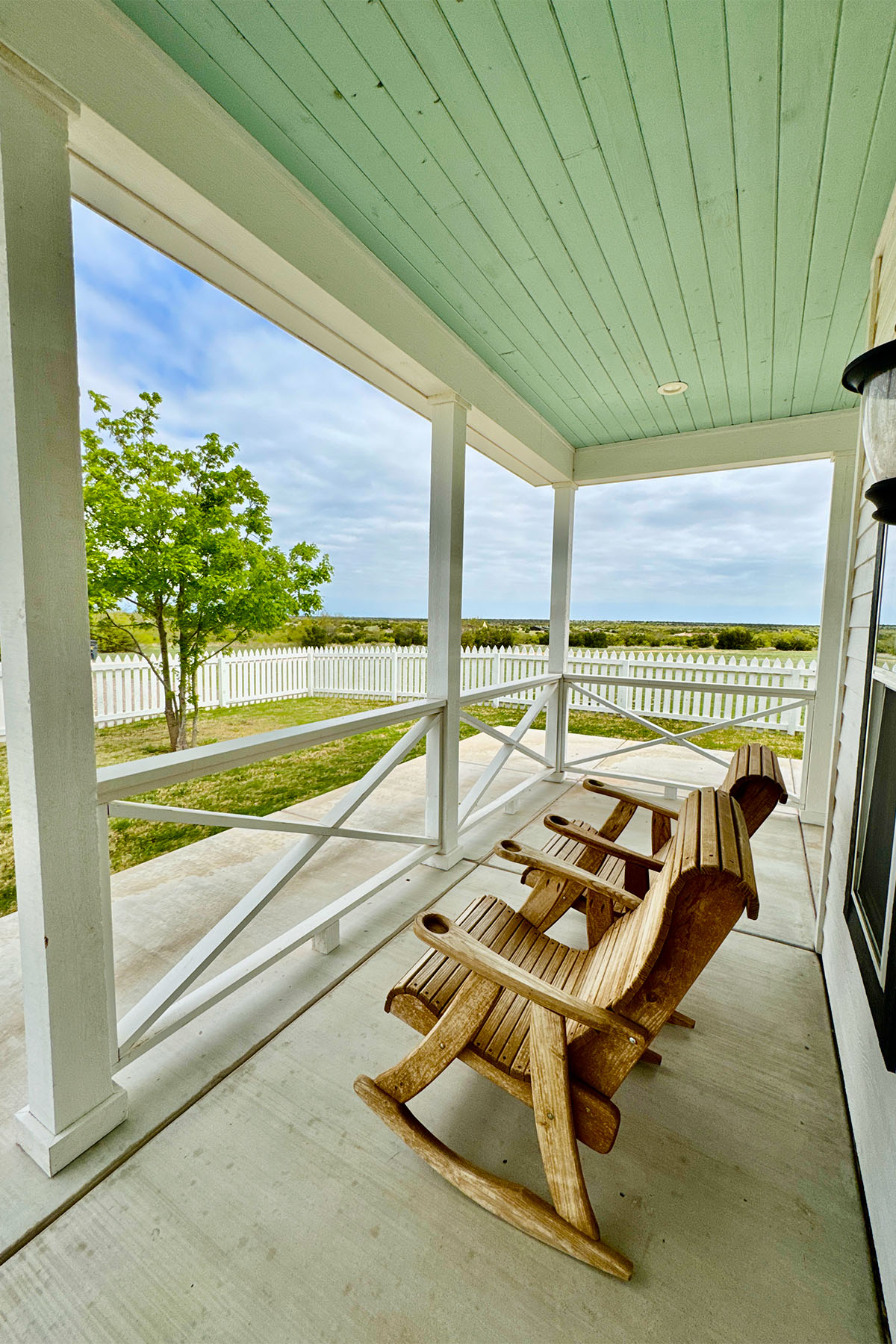 If you’ve ever wished you could live in a famous painting, here’s your chance! Doves Rest Four Gables Cabin looks like it came straight from Grant Wood’s American Gothic– you know the picture with the couple (and their pitchfork) standing in front of their farmhouse. We’re charmed by the idea to build such a quintessentially American cabin for your enjoyment. Rooms are large and open, especially the arrangement of the kitchen, eating, and living areas making the main floor feel much larger. Big porches front and rear make for great group gatherings. Surrounded by a white picket fence keeps the Texas Longhorn Cattle at bay as you enjoy being front and center on a working cattle ranch.