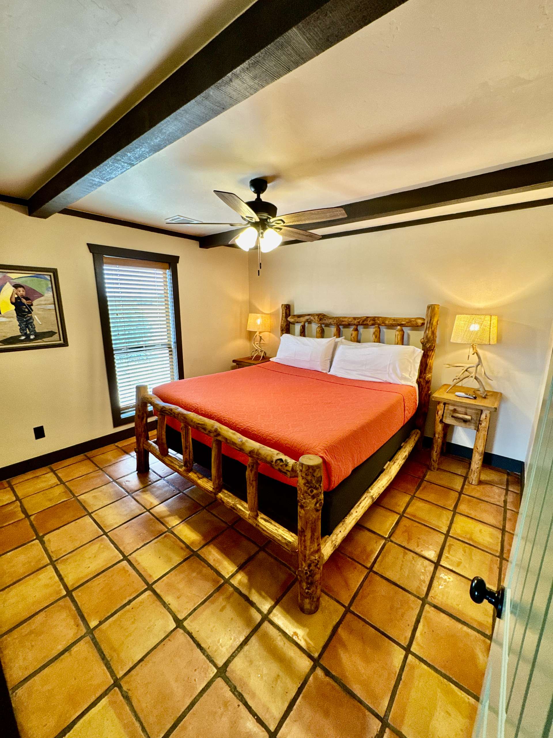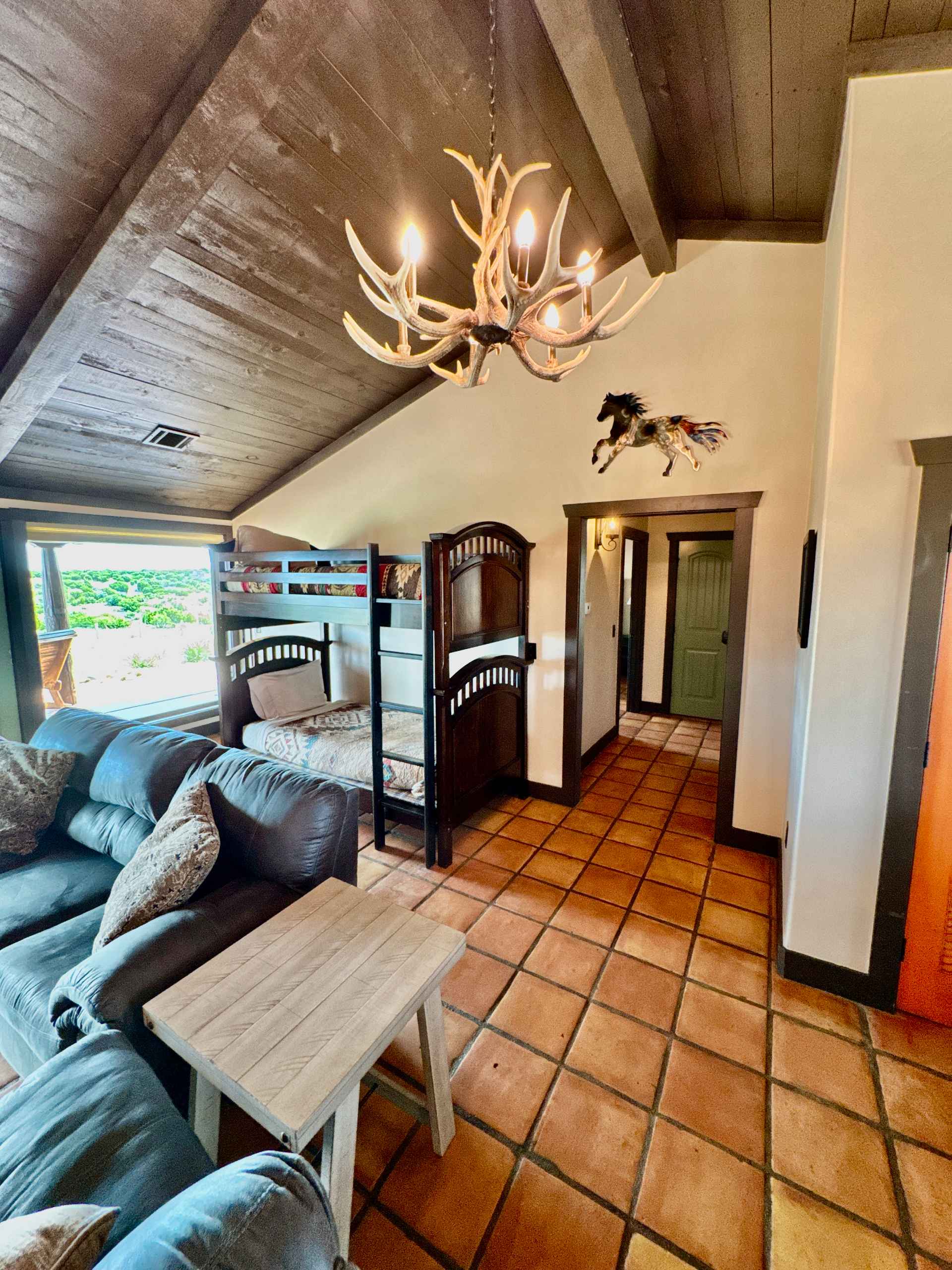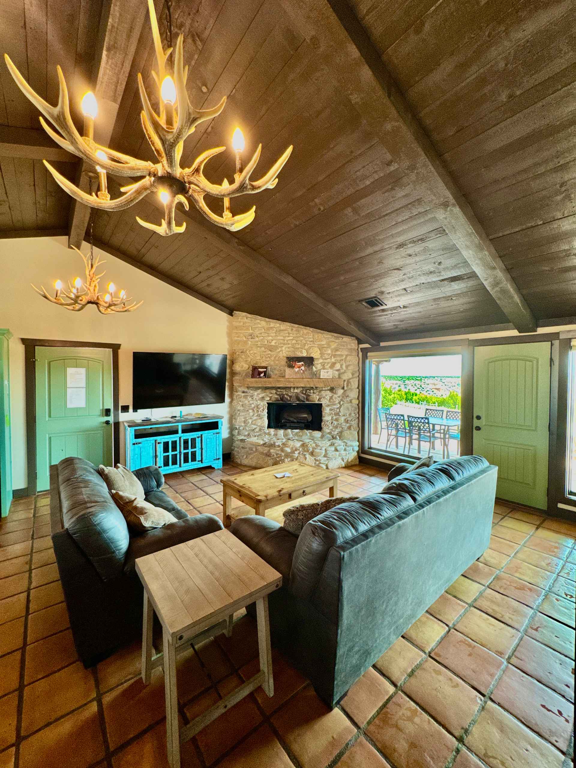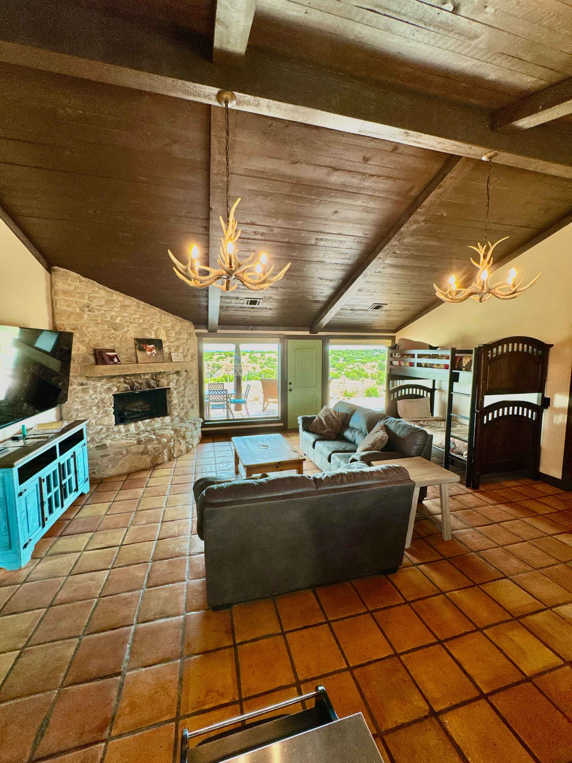 The Laredo is a charming 1,200 sq. ft. 2- King bedroom cabin with 2 bathrooms, one of which features a walk in shower for accessibility. In the living area a luxury pull out queen sofa bed and a twin sofa bed await you, so ideally it can sleep 4 to (7) guests comfortably. Fireplace and dramatic canyon view of the Canyon’s North Rim make for quite a quiet getaway from city life.